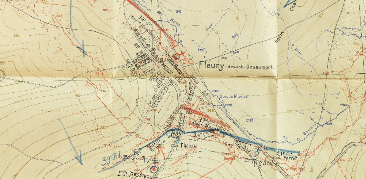- Vers 21h30, les Allemands inondent Fleury et le ravin avec des projectiles de petit calibre qui n’éclatent pas. Le sifflement est continu. L’atmosphère se voile. L’air devient irrespirable. On s’aperçoit tout de suite qu’il s’agit d’une émission considérable de gaz asphyxiants par un procédé et avec une violence jusqu’alors inconnus. L’alerte est immédiatement donnée et tous les hommes mettent leur masque. Cet appareil protège efficacement si on reste immobile mais tout mouvement en particulier la marche avec le sac est rendu pour ainsi dire impossible, le souffle manquant… Beaucoup d’hommes sont intoxiqués et tombent.