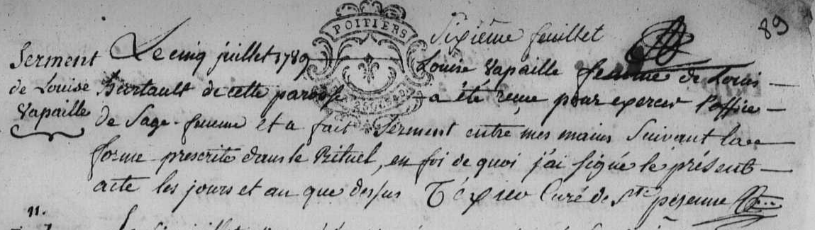 Louise se marie le 3 juillet 1780, elle a 30 ans et épouse Louis Hurtault, un veuf de 16 ans son ainé. Ensemble ils ont au moins une fille, Louise Catherine, qui nait en 1783. Et c’est dans cette même paroisse, devant le curé Texier, qu’elle prête serment de sage-femme le 5 juillet 1789, à l’âge de 39 ans.