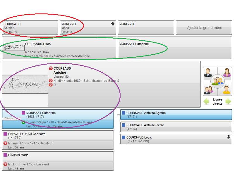 Le grand-père, Antoine Coursaud épouse Marie Morisset en 1648 à Coulonges-les-Royaux (Coulonges-sur-l’Autize aujourd’hui), son fils Gilles Coursaud se marie avec Catherine Morisset en 1679 à Saint-Maixent-de-Beugné, enfin le petit-fils, Antoine Coursaud, est uni à Catherine Morisset en 1716 dans la même paroisse.