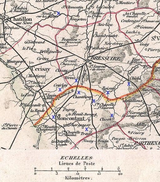 Il m’a donc fallu donc zoomer sur les Deux-Sèvres et plus précisément encore sur le bocage bressuirais pour que je trouve mes trésors généalogiques. Je ne vais pas y mettre tous les X, toutes les paroisses ou communes, mais seulement les 10 les plus fréquemment citées dans mon arbre.