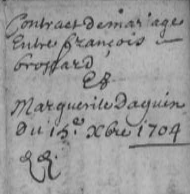 Le 15 décembre 1704, à Loge-Fougereuse (Vendée), maître François Mosnay, notaire, rédige un contrat de mariage : celui de François Brossard, menuisier, 29 ans, avec Marguerite Daguin, sans doute un peu plus âgée. François Brossard est un des fils de mes ancêtres Jean Brossard et Marie Verdon. Marguerite Daguin en est à sa 3ème union : elle est veuve de Jean Augier qu’elle a épousé en 1ère noce en 1690, elle est aussi veuve de son second mari Jean Bertaud épousé en 1699. De son 1er mariage, elle a un enfant Jean Augier, peut-être âgé d’une dizaine d’années.