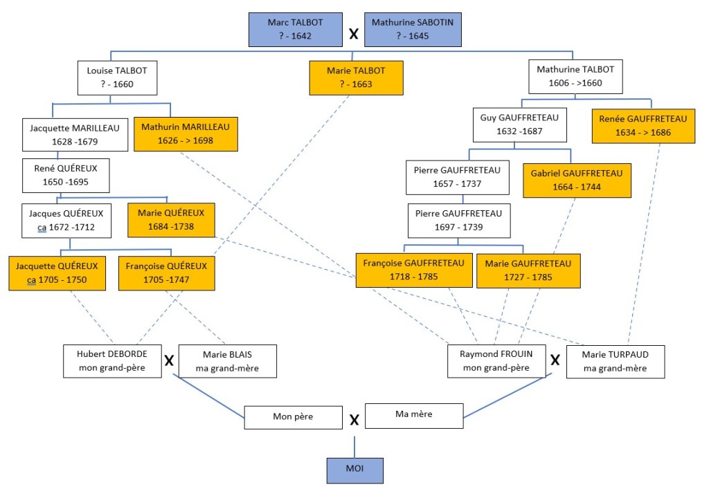 Avant 1612, Marc et Mathurine ont eu au moins 6 enfants dont 3 filles, Louise, Marie et Mathurine, sont mes aïeules. Si je remonte jusqu’à Marie par une seule voie, j’utilise par contre 4 chemins différents pour rejoindre Louise ou Mathurine.