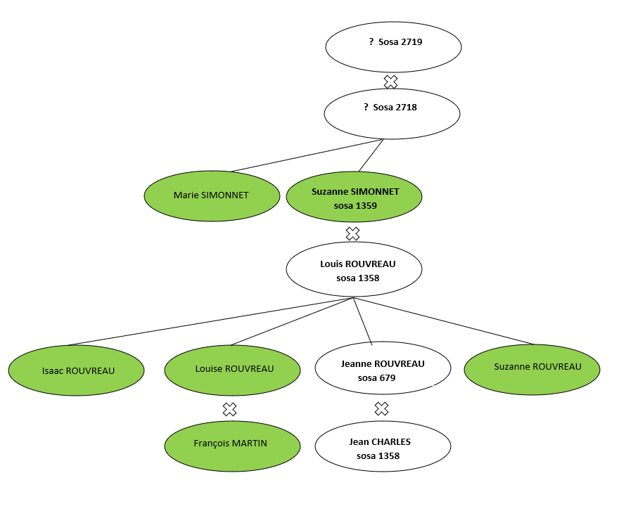 S’agissant d’un second mariage, j’ai pu également me procurer le contrat du premier mariage de Louise, toujours chez maître Gibaud en 1683. Il m’apporte de nouvelles personnes : Isaac et Suzanne Rouvreau, frère et sœur, une tante Jeanne Rouvreau ainsi qu’un cousin germain, Pierre Juin. Mon arbre grandit un peu ! En vert les nouveaux membres.