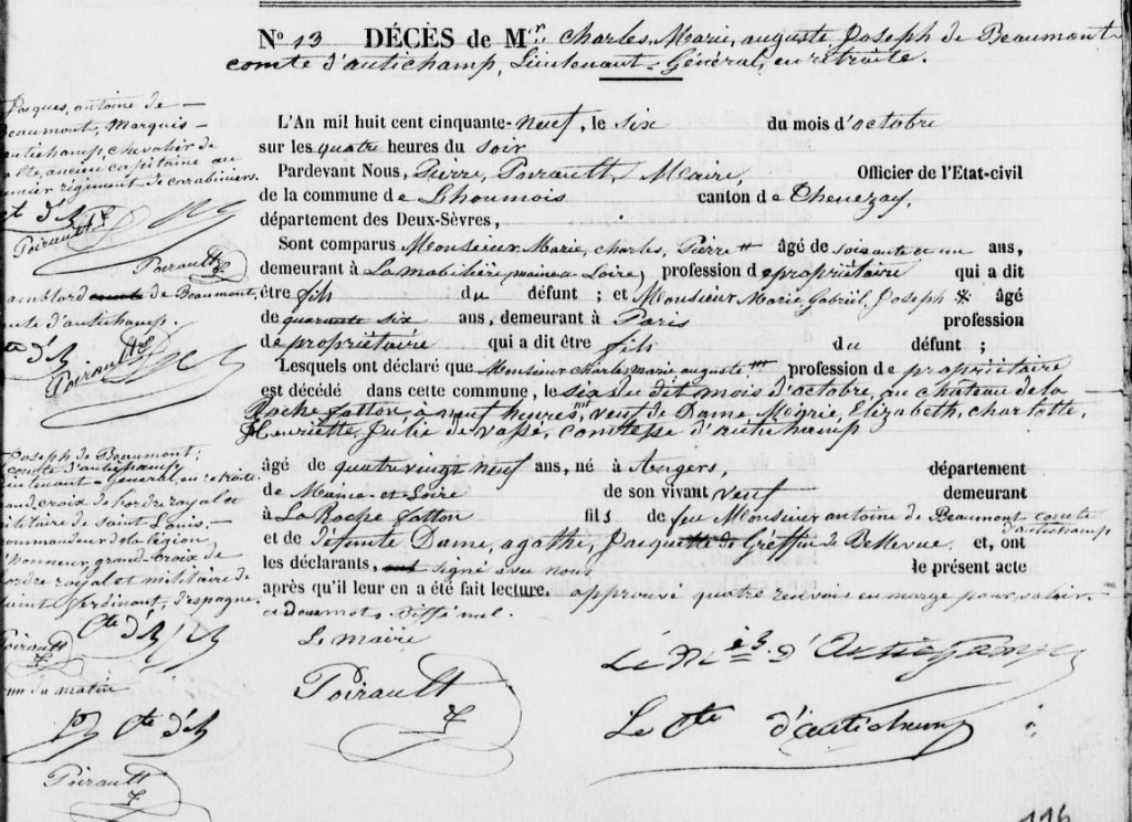 18. Acte de décès de Charles Marie de Beaumont, Comte d’Autichamp, décédé à 89 ans le 06/10/1859 à Lhoumois au Château de La Roche Faton.