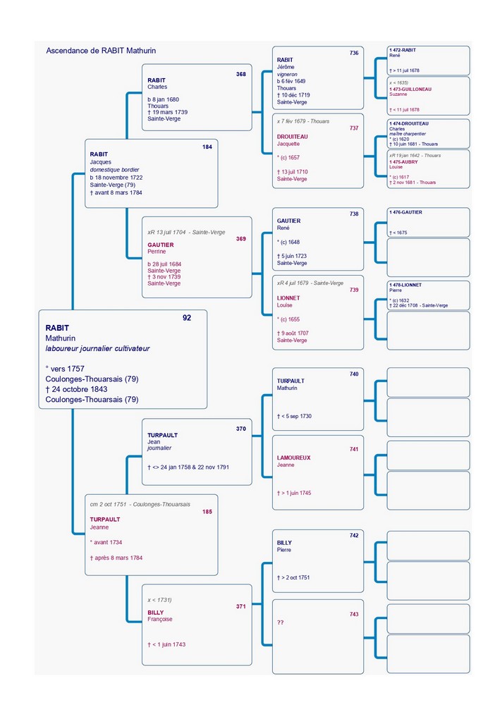 Pour conclure, il ne faut surtout pas se décourager mais insister (et aller aux AD). De Mathurin Rabit, sosa 92, dont je ne connaissais que son dernier mariage en 1805, pour lequel j’ignorais complètement l’ascendance, je lui connais maintenant de nombreux ancêtres, certains nés au tout début du XVIIe siècle. Comme quoi les visites en salle de lecture (et un peu de chance) finissent par payer !