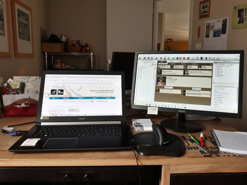 Vous êtes peut-être déjà tous adeptes du double écran, mais si vous n’avez pas encore opté pour ce choix, laissez-moi vous expliquer en quoi il a changé ma façon de travailler. En effet, outre mon logiciel de généalogie, mon 2e écran m’est rapidement devenu indispensable et je l’utilise depuis de nombreuses années. Il me permet d’avoir toujours mon logiciel de généalogie ouvert sur un écran et de consulter mes recherches sur l’autre (que ce soit le site des AD ou un autre). Il devient alors beaucoup plus facile de dépouiller un acte puisque la transcription, les vérifications ou les notes peuvent se rédiger en même temps, sans faire d’aller et retour du document consulté au logiciel de généalogie. Cette simple option vous change la vie ! À tel point qu’aujourd’hui j’aimerais en avoir un 3e afin d’avoir en permanence mon logiciel, les Archives départementales et ainsi pouvoir utiliser le dernier pour la recherche complémentaire. Je travaille avec un portable et un grand écran. Avoir cet écran plus grand m’offre plus de confort de lecture.