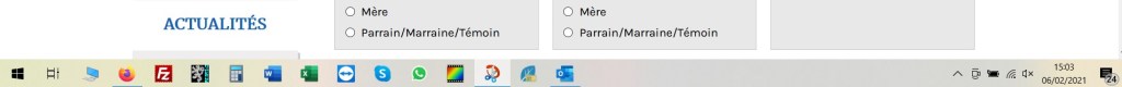 Dans la barre de tâches, en bas de votre écran, vous pouvez mettre ce qui vous sert au quotidien. Dans la mienne, j’ai les icônes de retour au bureau, de mon navigateur Firefox, ensuite 2 icônes pour la généalogie, la calculette, Word et Excel, TeamWiewer (logiciel de télémaintenance très pratique quand je demande à mon fils de me régler un problème à distance), Skype et WhatsApp pour les échanges vidéo, PhotoFiltre pour le traitement des images, la capture d’écran pour toutes mes copies d’actes, mon logiciel généalogie et ma messagerie. Ainsi, quand mes 2 écrans sont ouverts, je peux sans revenir au bureau, ouvrir immédiatement un de ces logiciels, outils ou programmes.