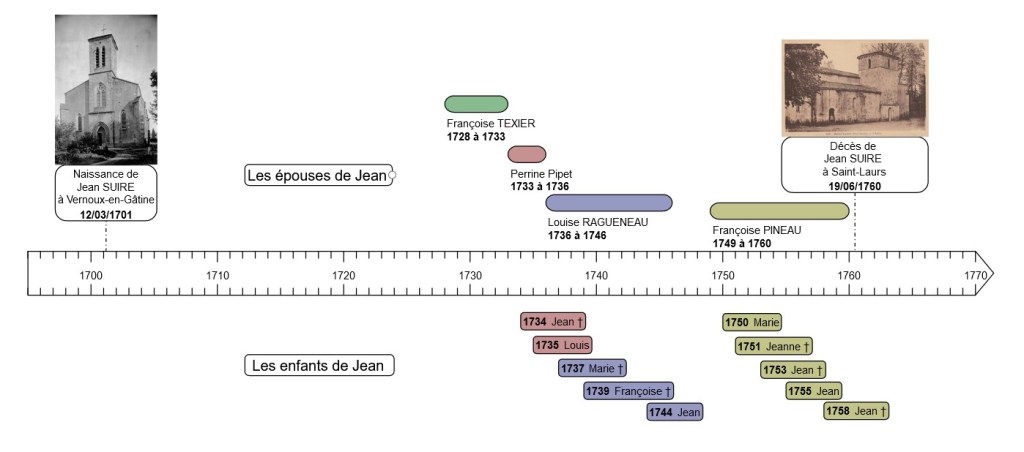 Jean Suire a vécu 59 ans, il s’est marié 4 fois et a eu au moins 11 enfants. Malgré cette nombreuse descendance, seul mon ancêtre Louis, aura à son tour une postérité. Pour illuster sa vie, comme Raymond, j’ai moi aussi testé frisechronos.fr. Je confirme, la prise en main est simple et intuitive. En prime, une petite vidéo pour vous aider !