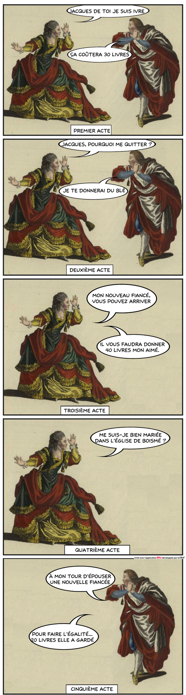Voilà, mon scénario est fini. Il ne me reste théoriquement plus qu’à redonner vie à mes personnages, écrire les dialogues, faire claquer des portes… pour finir ma pièce de théâtre « Jacques et Marie-Jeanne », drame rural et monétaire en 5 actes. Comme je l’ai dit en préambule, j’ai préféré faire une courte bande dessinée grâce à l’outil BDnF. L’image qui m’a servi pour la créer est une estampe de Jehannin de Chamblanc, Zénobie et Radamiste (Source Gallica – BM Dijon).