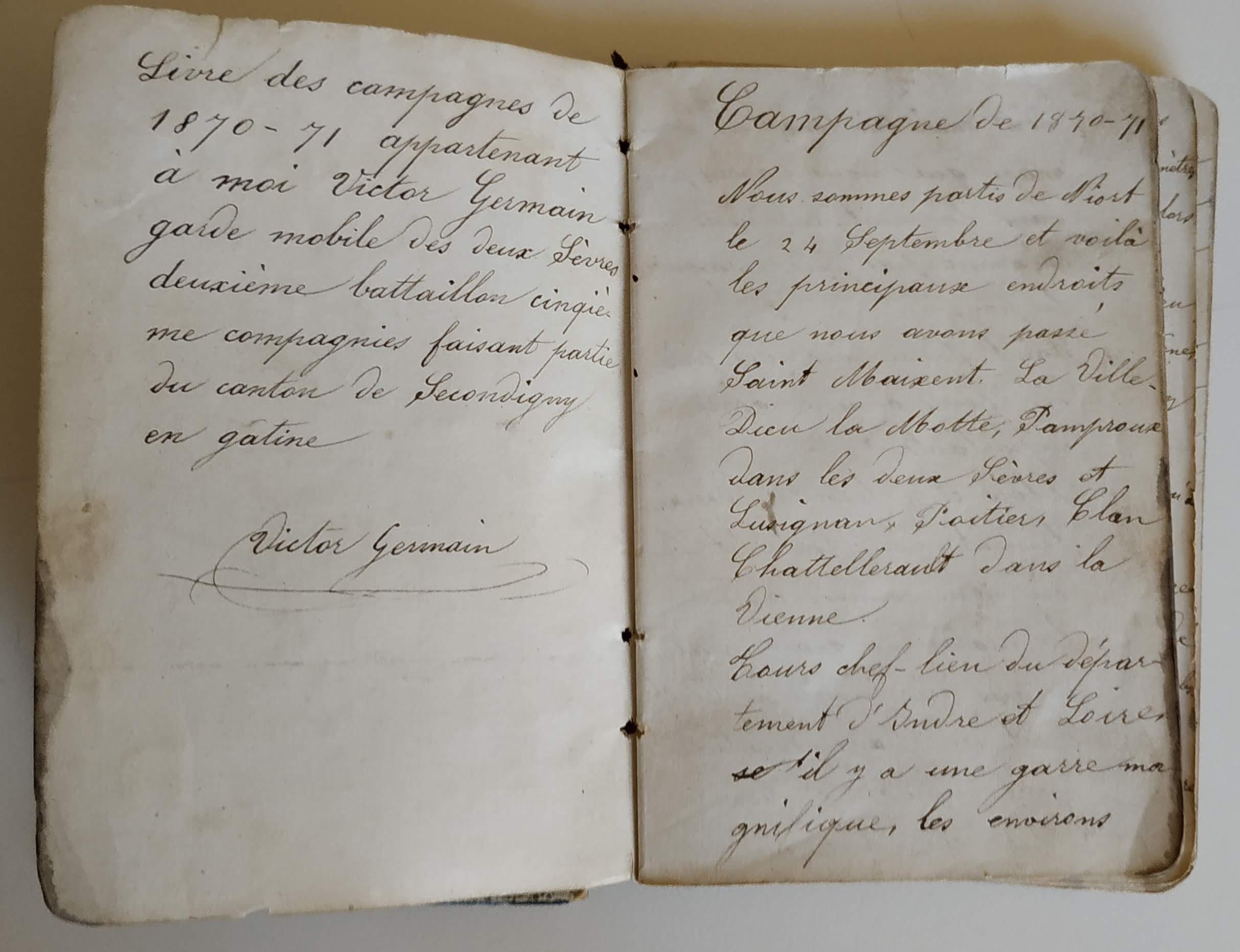Victor GERMAIN est l’un des deux survivants que j’ai choisi de raconter durant ce mois consacré aux combattants de 1870. Il a noté au jour le jour sur un carnet intitulé « Livre des campagnes 1870-71 » ses souvenirs de la guerre. Versé dans le 34e régiment d’infanterie composé des « Moblots » des Deux-Sèvres, il raconte son voyage en train de Niort vers le front : Nous sommes partis de Niort le 24 Septembre et voilà les principaux endroits que nous avons passé. Saint-Maixent La ville-Dieu la Motte, Pamproux dans les Deux-Sèvres….