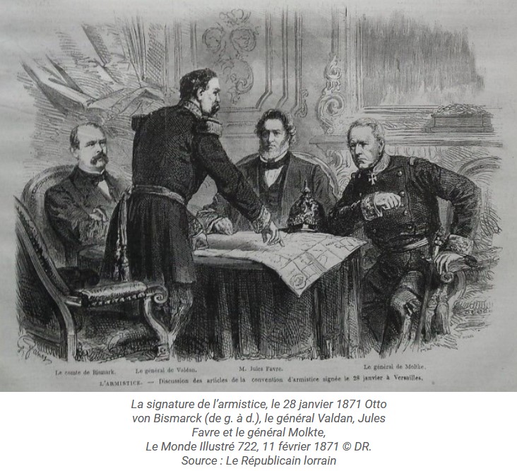 Le gouvernement de la Défense nationale demande l’armistice le 28 janvier 1871. Les Allemands peuvent entrer dans Paris et la capitale doit verser une rançon de 200 millions de francs. Gambetta qui voulait continuer le combat démissionne du gouvernement le 6 février. Le traité de Francfort du 10 mai 1871 fixe les conditions de la paix. Elles sont sévères pour la France : perte de l’Alsace et d’une partie de la Lorraine, 5 milliards de francs-or d’indemnité à verser en 3 ans… La dureté de ce traité est la source d’une détestation du voisin allemand et d’un désir de revanche exacerbé par les hommes politiques. Il est une des causes de la future Première Guerre mondiale, de la même façon que celui de Versailles en 1918 créera les conditions de la Seconde Guerre mondiale.