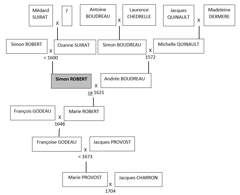 C’est en faisant des recherches sur une branche un peu oubliée de mon arbre, celle de Marie Provost, épouse de Jacques Charron, que j’ai croisé Simon Robert. Grâce à ce dernier, j’ai fait quelques belles découvertes.