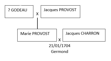 Pourtant, tout avait mal commencé ! Ce bout de branche s’arrêtait avec le mariage de Jacques et Marie, le 21 janvier 1704 à Germond, mais l’acte n’était pas complétement filiatif. Au début de mes recherches je n’ai pas porté beaucoup d’attention aux témoins. C’est en y revenant il y a quelques temps que j’ai pris conscience de l’aide qu’ils pouvaient m’apporter. En effet, sont mentionnés sur l’acte de mariage, le père de l’épouse : Jacques Provost, un oncle : Michel Godeau et un cousin : Pierre Godeau.