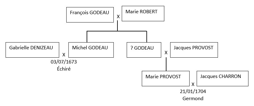 L’acte est filiatif, ainsi j’apprends que Michel Godeau est l’époux de Gabrielle Denizeau. Je retrouve ensuite l’acte de mariage de Michel avec Gabrielle, le 3 juillet 1673 à Échiré.  Ce nouvel acte me donne les parents de Michel, François Godeau et Marie Robert. De plus, est présent au mariage, mon ancêtre Jacques Provost en tant que beau-frère. Jacques Provost (sosa 1398) a donc épousé une fille Godeau (sosa 1399) dont je connais les parents : François Godeau (sosa 2798) et Marie Robert (sosa 2799).