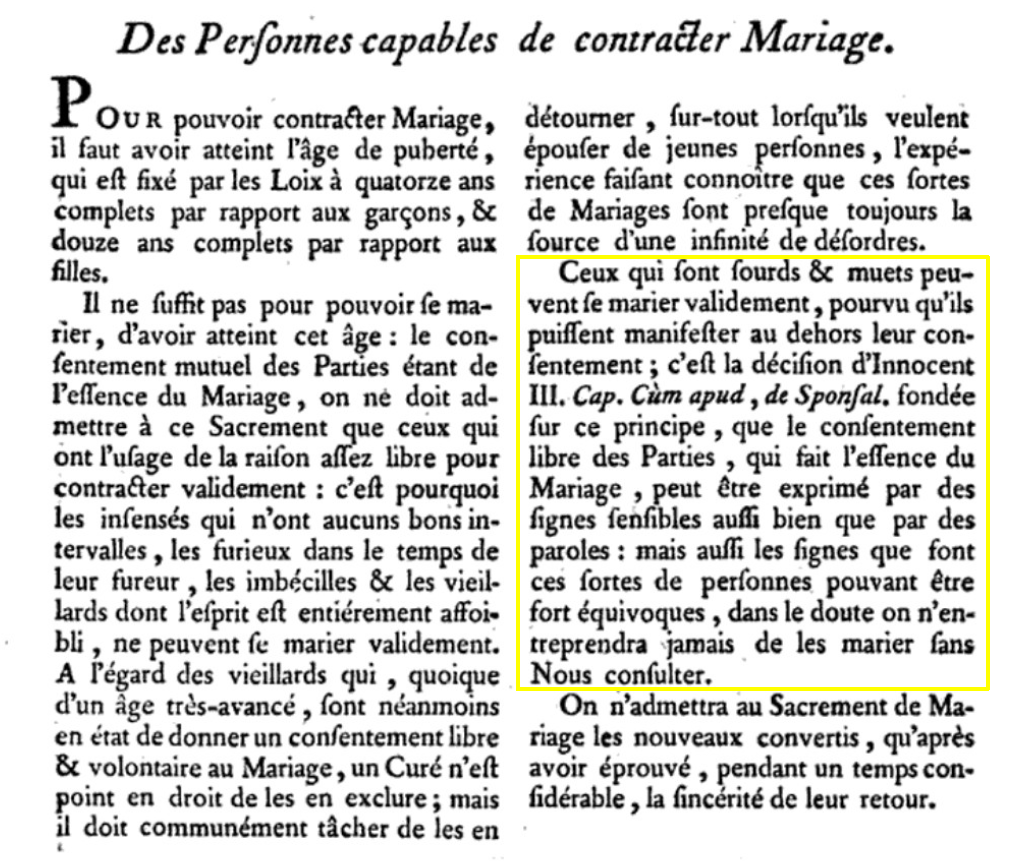 Toujours dans ce même livre, on nous explique quelles sont les personnes capables de contracter mariage, et parmi elles, les « sourds et muets » sont évoqués. Leur consentement peut être exprimé par des signes. Cela n’a pas toujours été le cas. C’est le pape Innocent III qui a ouvert le mariage aux sourds et muets à la fin du XIIe siècle. Cela était impossible auparavant, car les futurs époux devaient exprimer clairement leur consentement et dire « oui » devant les témoins et le prêtre.