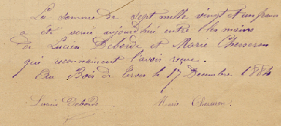 Voilà les lieux, les objets, le travail, les personnes qui vivaient dans cette ferme. Je devine ce qu’ils mangent, où ils dorment, comment ils s’éclairent et se chauffent. Il ne reste plus qu’à imaginer leurs journées bien remplies au rythme des jours et des saisons, aux champs, à l’étable, à la basse-cour, dans une ferme plutôt prospère. Quand la fille de Marie Roy, Marie Chesseron, quitte les Touches pour vivre avec son mari à la fin de l’année 1884, elle part avec le sixième qui lui est dû, un peu plus de 7 000 francs, ce qui représentait une belle somme à l’époque (entre 20 et 30 000 euros d’aujourd’hui).