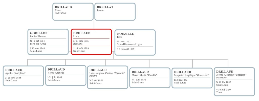Louis Drillaud quant à lui n’a pas toujours tenu une auberge. Ce fils de cultivateur est né à Béceleuf en 1816. Il est d’abord boulanger à Saint-Laurs après son mariage en 1843 avec Louise Thérèse Godillon. Très vite veuf, il épouse l’année suivante Rose Nouzille avec qui il a 6 enfants entre 1845 et 1857. Sa boulangerie est située d’abord au lieu-dit du Prieuré de Saint-Laurs puis au village de la Rampière, là où vivent de nombreux mineurs. À une date située quelque part entre 1861 et 1866, Louis Drillaud, peut-être pour s’adapter aux envies de la population ouvrière, renonce au métier de boulanger pour celui d’aubergiste, toujours à la Rampière. Il s’installe ensuite au village de Bégrolles avant 1872 à l’hôtel de la Gare tout juste ouvert et propriété de M. de Chantreau. En 1886, il déclare même être maître d’hôtel. C’est là qu’il meurt en 1889, âgé de 73 ans. Sa femme Rose Nouzille lui survit longtemps. Elle décède en 1905 âgée de 83 ans.