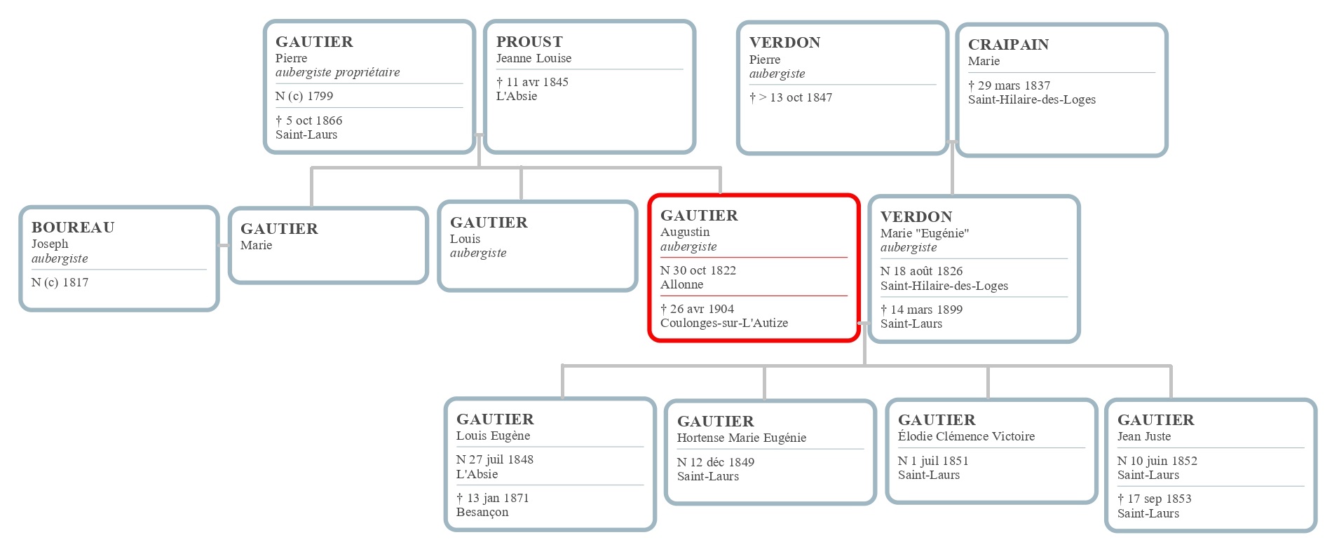 Augustin dit Auguste Gautier est né à Allonne en 1822 et il a toujours été aubergiste. Il ne pouvait en être autrement : il est le fils  d’un aubergiste installé à L’Absie ; son frère et son beau-frère sont aussi aubergistes ; et en 1847, il épouse à Coulonges-sur-l’Autize, la fille d’un aubergiste, Eugénie Verdon. Un an après son mariage, la famille quitte L’Absie pour  s’installe à Bégrolles de Saint-Laurs. Sans doute ont-ils perçu qu’il y aurait de la clientèle avec les mines et l’essor de la commune. Le couple a 4 enfants entre 1848 et 1852. Ils perdent un garçon en bas âge et le 2e fait partie des victimes de la guerre de 1870. En 1872, ils vivent donc avec leurs 2 filles pas encore mariées et sont aidés par un domestique et son épouse, preuve que le commerce doit alors bien fonctionner. Ils tiennent l’auberge au moins jusqu’en 1891. En 1899, Eugénie Verdon décède dans sa maison de Bégrolles âgée de 72 ans. Auguste Gautier meurt en 1904 à l’âge de 81 ans, recueilli pour ses vieux jours chez une de ses filles à Coulonges-sur-l’Autize.