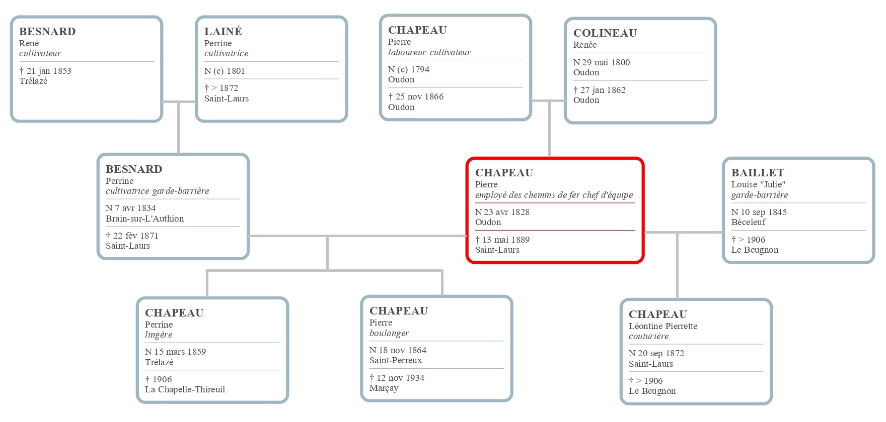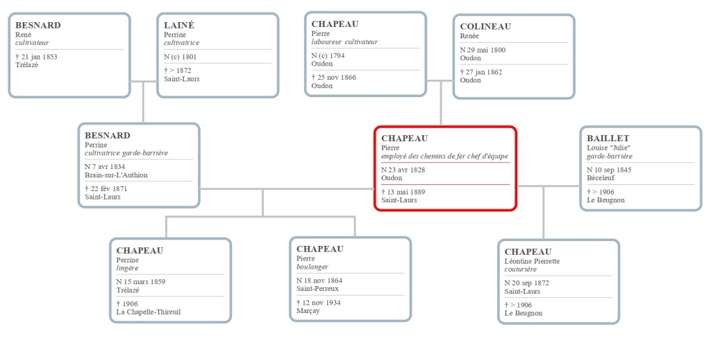 En réalité, Pierre Chapeau est né à Oudon en Loire-Atlantique, il est fils d’un autre Pierre Chapeau, laboureur, et de Renée Colineau. Le couple parental a 6 enfants, l’aînée Marie voit le jour un mois avant le mariage de ses parents. La famille demeure à Oudon et c’est là que les parents décèdent. Les 2 fils de la famille travailleront tous 2 au chemin de fer, on peut supposer que la ferme était trop petite pour faire vivre les enfants et qu’il fallait trouver du emploi ailleurs. Pierre passe son enfance à Oudon En 1858 il se marie Perrine Besnard à Trélazé dans le Maine-et-Loire. Il a 30 ans et est employé au chemin de fer. Quant à Perrine, elle travaille avec ses parents à la ferme familiale. L’année suivant, une petite fille, Perrine, naît.