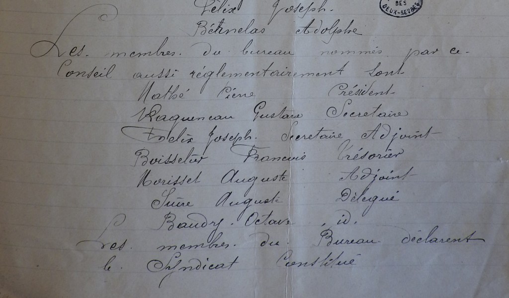 Les ouvriers ont aussi pris conscience que leur association Saint-Laurs/Faymoreau n’est pas viable : ils ne dépendent pas de la même compagnie et sont sur 2 départements différents. C’est pourquoi, après la grève, les mineurs de Saint-Laurs créent leur propre chambre syndicale lors d’une assemblée générale qui réunit 103 travailleurs. Auguste Morisset fait partie du bureau, il est élu en tant que trésorier-adjoint, je retrouve sa signature au bas de l’acte officiel fondateur le 5 juin 1896.