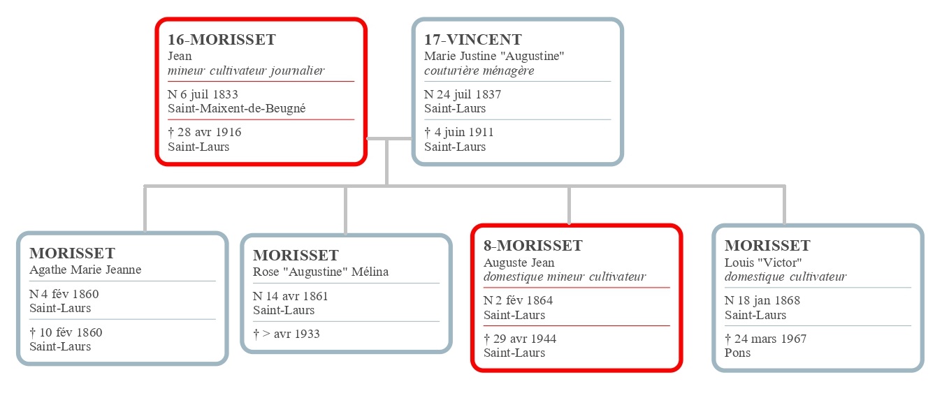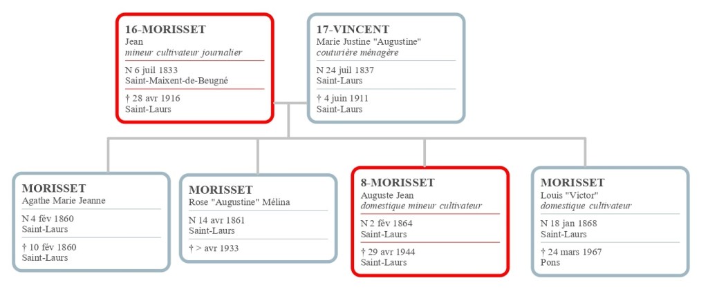 Mon arrière-grand-père Auguste Morisset, comme son père avant lui, quitte bientôt la mine pour revenir aux travaux des champs, il laisse alors sa place au syndicat. En 1901, il redevient paysan et le restera. Mais son engagement, et celui de quelques autres, a permis une avancée sociale pour les ouvriers, alors que, du temps de son père, en 1872, aucune protection n’existait pour les travailleurs de la mine de Saint-Laurs.