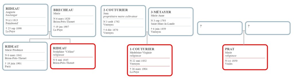 Célina Rideau aurait pour parents Auguste Rideau, boulanger, et Marie Brecheau qui habitent à La Puye au moins depuis 1866. Ce couple s’est constitué le 23 octobre 1833 à Brion-près-Thouet dans les Deux-Sèvres. Ils ont eu deux filles, Marie Prudence Rideau née à Brion le 6/3/1841 décédée en religion à Paris en 1901 à 60 ans et Joséphine Rideau née le 8 mai 1845 elle aussi à Brion qui pourrait bien être ma Célina Rideau. La vocation de sa sœur, l’âge, le domicile de ses parents à La Puye, travaillant sans doute pour la communauté religieuse, tout m’incite à le croire. Célina Rideau est toujours religieuse institutrice en 1896 mais cette fois à Aigre en Charente.