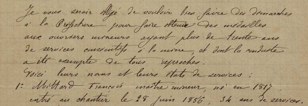 – Et Auguste, le 2e garçon né en 1854, qu’est-il devenu, pourquoi n’est-il pas là ? On travaillait très jeune autrefois. À 12 ans, Auguste était déjà au fond de la mine, aide terrassier travaillant en binôme avec un mineur. Il meurt à une heure du matin, le 12 juillet 1866, au puits de Sainte-Clotilde. Un courrier de la division des mines dépendant du ministère de l’Agriculture dit : « il n’est pas possible de rendre un compte exact des circonstances dans lesquelles a eu lieu l’accident« . La compagnie dégage toute responsabilité et on conclut : « l’accident doit être attribué à une imprudence du malheureux ouvrier qui en a été la victime ». L’imprudence d’un enfant de 12 ans travaillant au fond d’une mine à 1 heure du matin ! La mine était pourtant hors la loi, le travail des enfants de 12 ans la nuit était alors interdit.