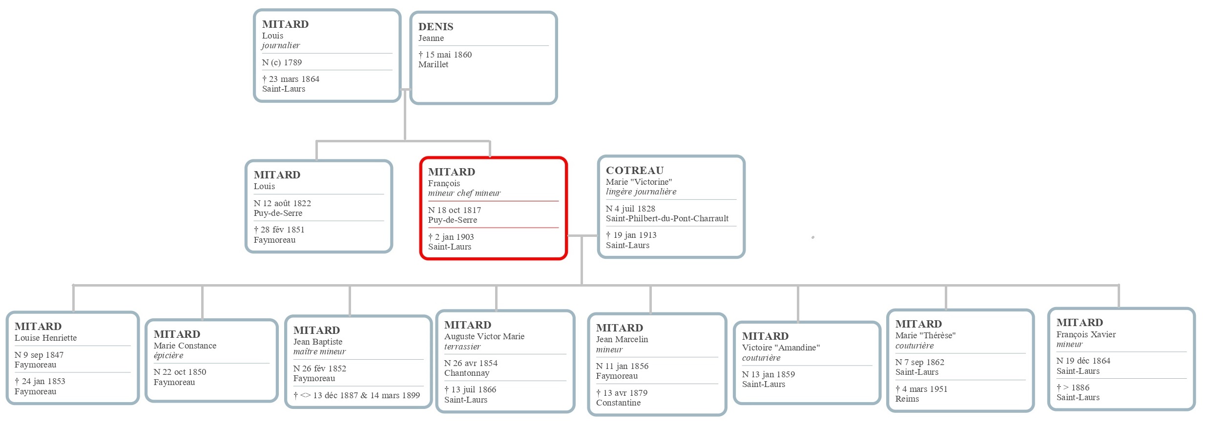 François Mitard est né en 1817 à Puy-de-Serre, tout près en Vendée. Il est le fils de Louis Mitard journalier et de Jeanne Denis. Sans doute pour échapper à une condition paysanne peu enviable, François et son jeune frère prénommé Louis comme leur père profitent de l‘ouverture des mines à Faymoreau pour y travailler en tant que mineur dès 1846. Cette même année, François Mitard se marie avec la fille d’un tisserand, Victorine Cottreau. Au cours des 18 premières années de leur mariage, ils auront 9 enfants : 5 filles et 4 garçons. L’aînée Louise décèdera à l’âge de 5 ans.