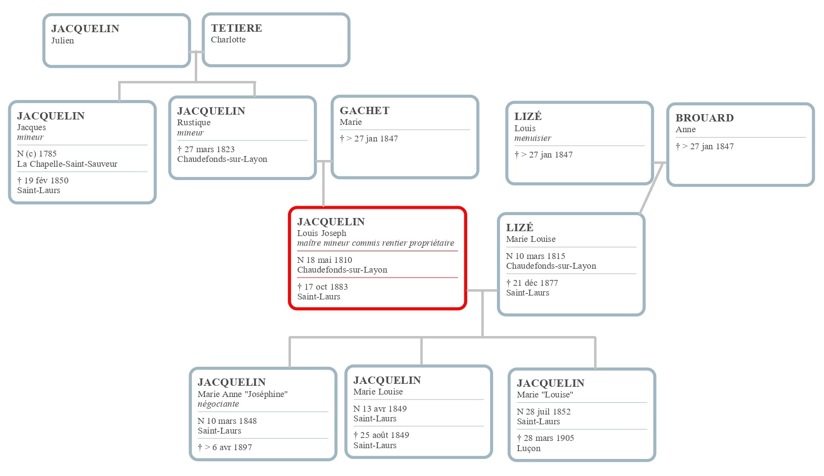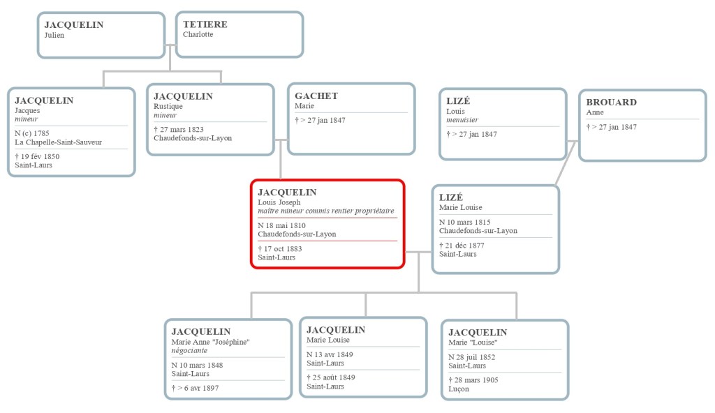 Devenu adulte, Louis Jacquelin fait donc le même métier que son père. Il a acquis un peu d’éducation puisqu’il sait lire et écrire. Il évolue professionnellement : il est maître mineur le 27 janvier 1847 lors de son mariage à 37 ans avec Louise Lizé, 32 ans, la fille d’un menuisier de la commune.
