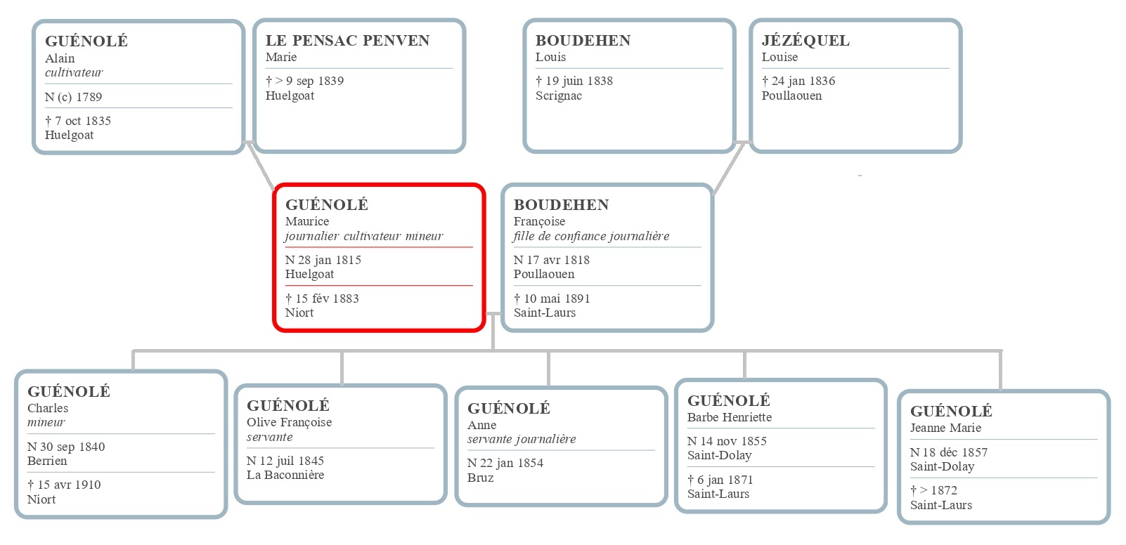 Maurice Guignolet s’appelle en fait Maurice Guénolé et il est né en 1815 à Huelgoat (Finistère) dans une famille de cultivateurs. Il épouse en 1839 dans sa commune natale Françoise Boudehen, fille de meuniers, née en 1838 à Poullaouen.