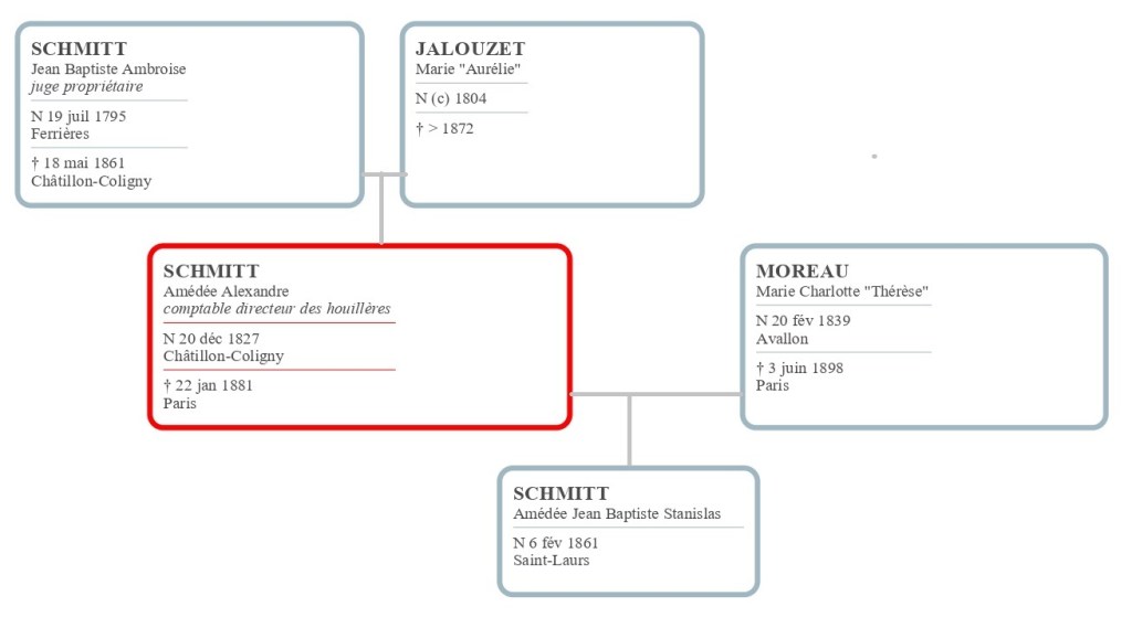 Quel est le métier d’Amédée-Alexandre Schmitt à Autun ? Je l’ignore. Il lui reste moins de 10 ans à vivre puisqu’il décède à Paris le 22 janvier 1881 à l’âge de 53 ans. Son acte de décès m’interroge sur les dernières années de sa vie professionnelle. Il y est précisé qu’il demeure effectivement à Autun mais qu’il est sans profession. Vivait-il de ses rentes ? Connaissait-il une passe difficile ? Cherchait-il un nouvel emploi ?