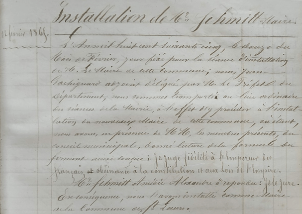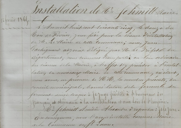 On dirait aujourd’hui que Schmitt détient le pouvoir économique et politique de sa localité mais, en réalité, sur l’aspect municipal, il s’occupe surtout de l’entretien des chemins, d’affaires scolaires ou de l’organisation de la fête nationale du 15 août durant l’Empire. En poste pendant la guerre de 1870, il en gère les conséquences locales, il doit trouver des fonds pour habiller les gardes nationaux de sa commune ou pour soigner des soldats blessés. On retrouve bien sûr son paraphe sur les actes d’état civil.