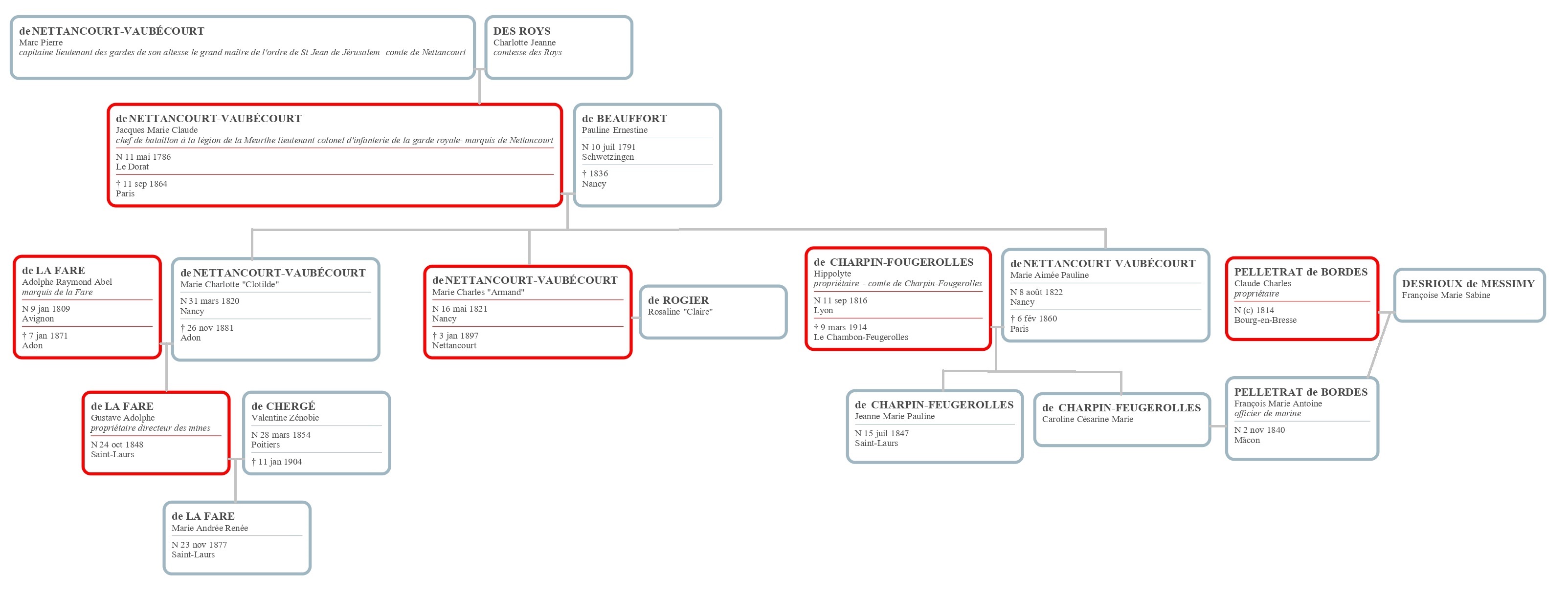 Le fils et les 2 gendres, de la Fare et de Charpin, sont très vite associés aux affaires car on s’inquiète pour la fortune familiale des dépenses faites par le marquis. Ils gèrent à distance l’aspect financier, la famille Nettancourt ne s’étant pas installée définitivement dans la commune. Le marquis avait pourtant fait bâtir un logis pour les cadres et dirigeants appelé le château des mines. Avant 1872, je n’ai trouvé que deux actes d’état civil qui concernent la famille :