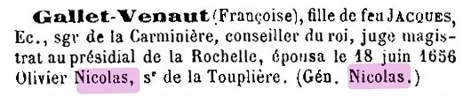 J’avais déjà consulté le Beauchet-Filleau mais j’étais passée à côté de cette information. En effet, dans mon arbre mon ancêtre Olivier NICOLAS a épousé Françoise GATET et non Françoise GALLET-VENAUT. Il pouvait certes s’agir d’un autre couple, cependant la date du mariage, 18 juin 1656, et le titre de l’époux, sieur de la Touplière, étaient trop proches des données connues pour mes ancêtres (mariage le 9 juin 1656 – sieur de la Taupelière) pour que je n’y regarde pas d’un peu plus près.