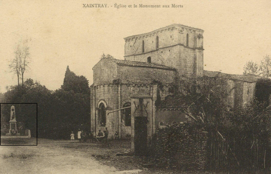 Il fallait trouver l’image cotée 40 FI 17348 aux AD des Deux-Sèvres et le mot XAINTRAY contenu dans le titre « Xaintray. Église et le monument aux morts »