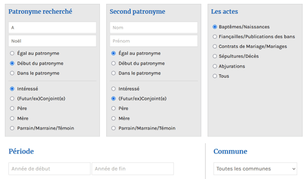 La recherche sur le prénom Noël est un peu plus technique. Pour cela, il faut faire une recherche en choisissant début du patronyme, de taper une seule lettre (A par exemple) en nom et Noël en prénom, de cliquer sur baptême puis sur rechercher.