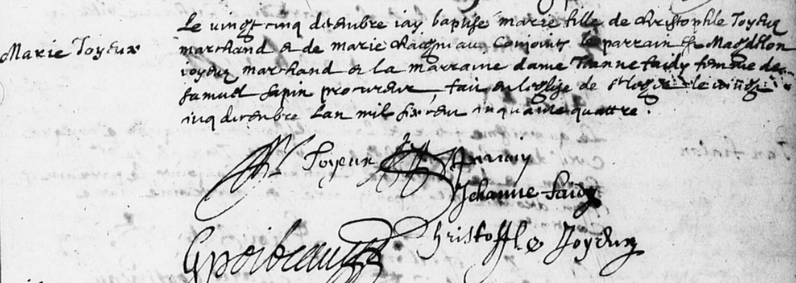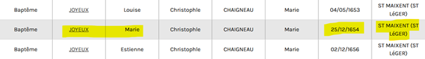 J’obtiens une liste de 90 naissances. J’ai la chance d’y relever une Marie Joyeux baptisée le 25 décembre 1654 à Saint-Maixent (paroisse de Saint-Léger). Je n’ai plus qu’à chercher l’acte sur le site des AD79. La première partie de ma mission est accomplie !