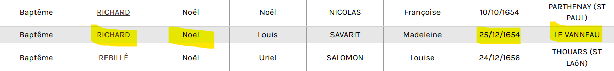 Comme Marie Joyeux est née le 25 décembre 1654, j’opte pour Noël Richard, né le même jour de cette même année au Vanneau, et je recherche illico son acte de baptême sur le site des AD79.