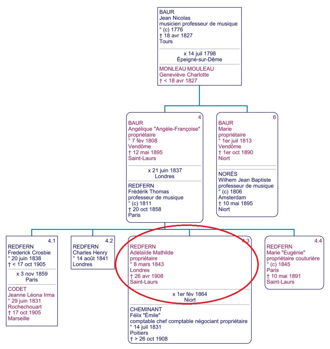 Adélaïde est en effet née à Londres le 8 mars 1843. Son père, Frederick-Thomas REDFERN, est anglais, mais je ne connais pas ses parents. Il vit à Londres avec son épouse française, Angélique BAUR. Angélique est née à Vendôme en 1808, de Jean-Nicolas BAUR, un musicien puis professeur de musique, et de Geneviève-Charlotte MOULEAU, Le couple a six enfants, Adélaïde est la quatrième. La famille, sans doute grâce au métier du père, a des relations ailleurs en Europe, d’ailleurs une des sœurs d’Adélaïde épousera un musicien originaire d’Amsterdam, Wilhem-Jean-Baptiste NORES. C’est peut-être au cours d’un voyage qu’Adélaïde rencontre Frederick-Thomas REDFERN, lequel est aussi à l’époque professeur de musique.