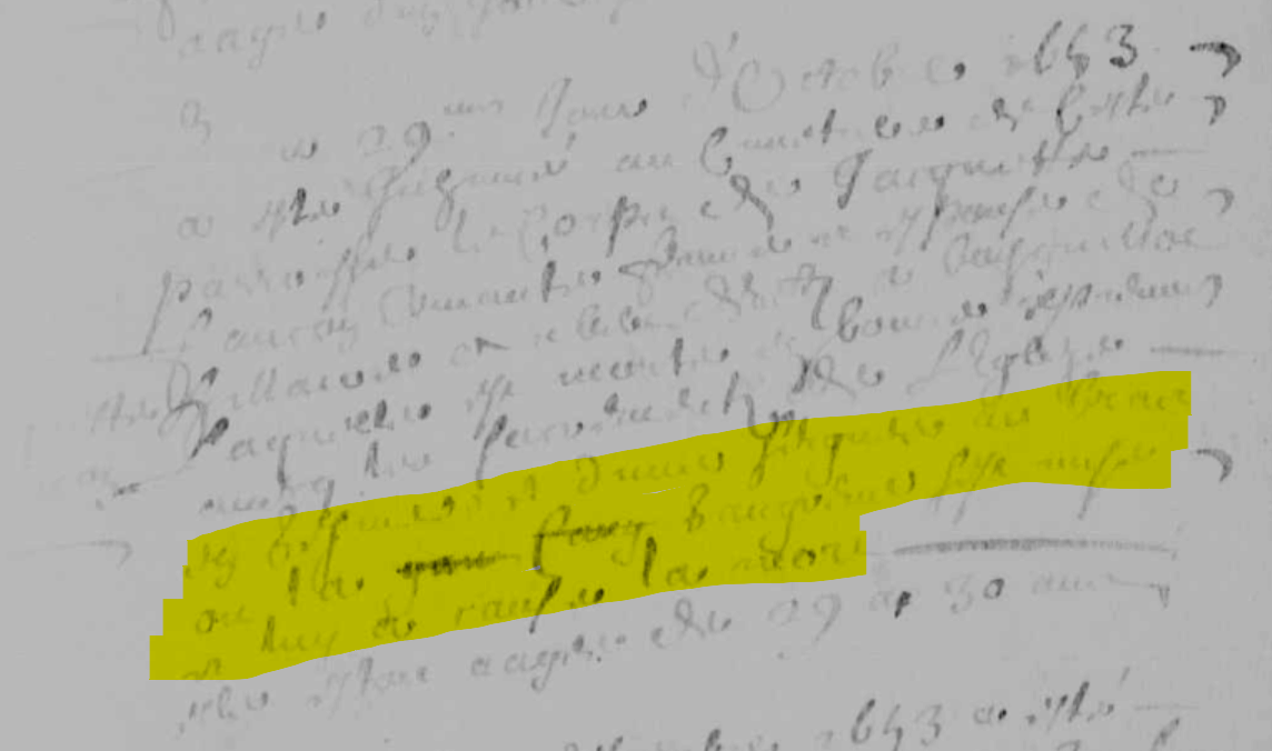 « Le 29e jour d’octobre 1653 a été inhumée au cimetière de cette paroisse le corps de Jacquette Faucon […] en gésine et d’une saignée au bras où la gangrène est mise et lui a causé la mort laquelle était âgée de 29 à 30 ans. »