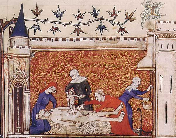 La césarienne tient son nom de Jules Cesar, lequel serait né ainsi, même si cette histoire tient sans doute de la légende. Cette intervention pratiquée depuis l’antiquité a été longtemps effectuée, comme ici, sur des femmes décédées pour tenter de sauver l’enfant. Quand celui-ci ne pouvait survivre, cela permettait de le baptiser. Les témoignages sont rares et il est difficile de savoir si certains enfants ont survécus après une telle naissance, sans doute furent-ils peu nombreux.