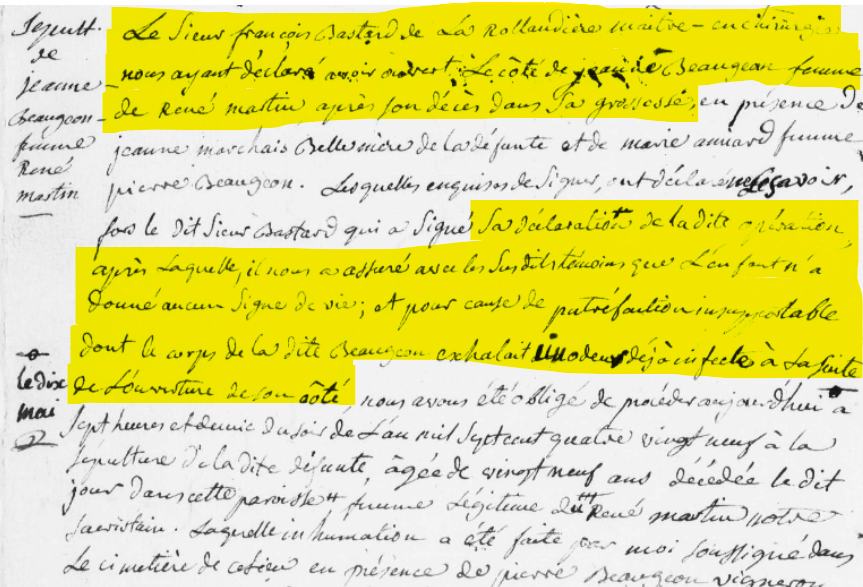 « le sieur françois Bastard de la Rollandière maître en chirurgie nous ayant déclaré avoir ouvert le côté de Jeanne Beaugean femme de René Martin après son décès dans sa grossesse en présence de jeanne Marchais Belle mère de la défunte et de Marie amard femme de pierre Beaugeon. Lesquelles enquises de signer ont déclaré ne le savoir, fors le dit Sieur Bastard qui a signé la déclaration de la dite opération, après laquelle il nous a assuré avec les sus dits témoins que l’enfant n’a donné aucun signe de vie ; et pour cause de putréfaction insupportable dont le corps de la dite Beaugeon exhalait une odeur déjà infecte à la suite de l’ouverture de son côté … »