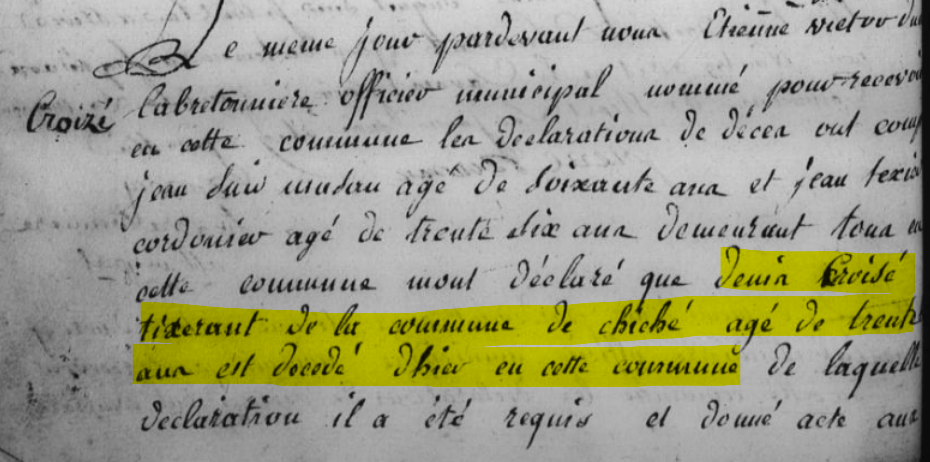 « Jean Suir mason agé de soixante ans et Jean Texier cordonier agé de trente six ans demeurant tous en cette commune mont déclaré que Denis Croisé, tixerant de la commune de Chiché agé de trente ans est décédé d’hier en cette commune…«