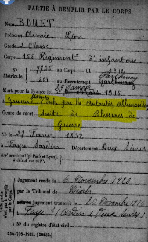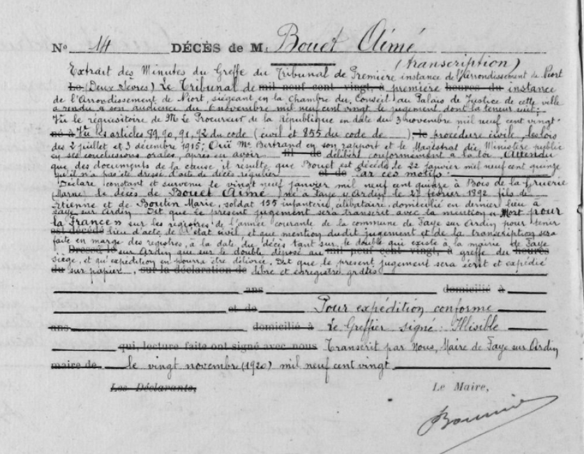 Il faudra attendre novembre 1920 et un jugement du tribunal de Niort pour que son décès soit reporté sur le registre de la commune de Faye-sur-Ardin.