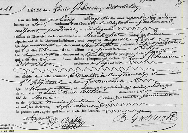 Louis GIBOUIN décède le 26 janvier 1835 à 5 heures du matin à l’hôpital de la marine, âgé de 34 ans.