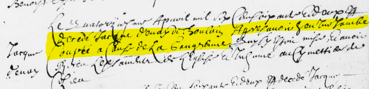 « le quatorizieme April mis six cent saoixante et deux est décédé Jacques Denay de Boulain après avoir eu une jambe coupée a cause de la Gangrene … »