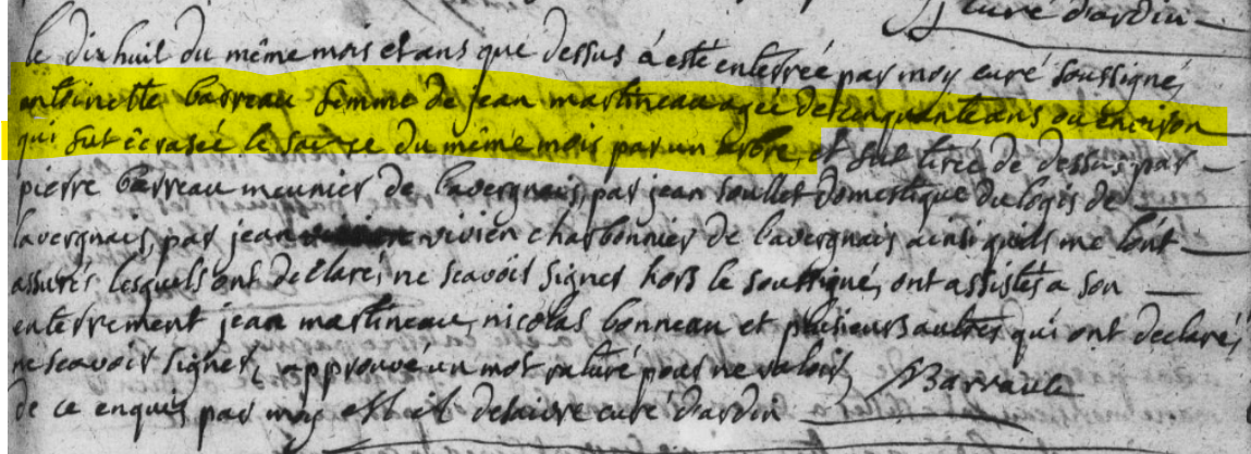 « le dix huit du même mois et ans que dessus à été enterré par moy curé soussigné antoinette barreau femme de jean martineau agée de cinquante ans ou environ qui fut ecrasée le saize du même mois par un arbre et fut tirée de dessous part pierre barreau meunier de lavergnais par jean soullet domestique du logis de lavairgnais par jean vivien charbonnier de lavergnais ainsi quils me l’ont assurés…