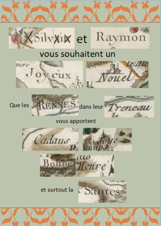 - Géoportail permet de chercher sur de nombreuses cartes (économiques, humaines, transports…) que l’on peut superposer en jouant sur la transparence. Parmi ces cartes, on retrouvent celles qui font partie de notre patrimoine : années 50, état major entre 1820 et 1866 et bien sûr, les cartes Cassini. Pendant longtemps la qualité de la numérisation laissait à désirer, ce n’est plus le cas. L’avantage de Géoportail, c’est qu’il n’y a plus qu’une seule carte, elles sont toutes fusionnées. Pas besoin de fouiller dans différentes cartes et surtout, on trouve directement le lieu recherché en tapant son nom dans la barre de recherche. C’est avec cet outil que je me suis éloigné de mes Deux-Sèvres pour visiter toute la France et créer ma jolie (?) carte de Noël à l’orthographe parfois approximative pour ce Noël 2024. Sylvie a découvert qu’il existait une commune nommée Raymond dans le Cher mais pas de lieu-dit Sylvie voire Sainte-Sylvie en France (ce qui est injuste et m’a obligé à tricher un peu).