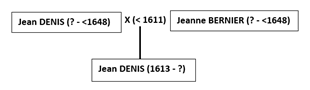 Cette branche est la plus lointaine et du coup la plus méconnue. Le couple formé par Jean DENIS et Jeanne BERNIER a vécu au Pin au moins entre 1611 et 1613 puisque deux de leurs enfants y sont nés, dont mon ancêtre prénommé Jean également. Je ne sais rien d’autre sur eux ! Quand Jean DENIS fils se marie en 1648 à Terves, ses parents étaient décédés et lui-même ne vivait plus au Pin.