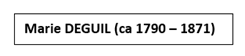 Marie DEGUIL, veuve du cultivateur Jean-Pierre POIRIER (tiens un autre arbre !), vient passe les dernières années de sa vie chez une de ses filles, Marie-Constance, après le décès de son mari en 1867. Originaire de Saint-Amand-sur-Sèvre, mariée en 1812 et mère de 8 enfants, Marie DEGUIL a passé l’essentiel de sa vie à Combrand, puis Montigny et finalement peu d’années dans la commune du Pin.